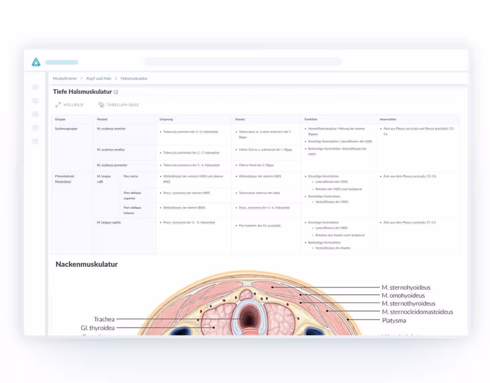 Nach Körperregionen gegliedert findest du im AMBOSS-Kapitel “Muskeltrainer” alle Muskeln mit Ursprung, Ansatz, Funktion und Innervation auf einen Blick.