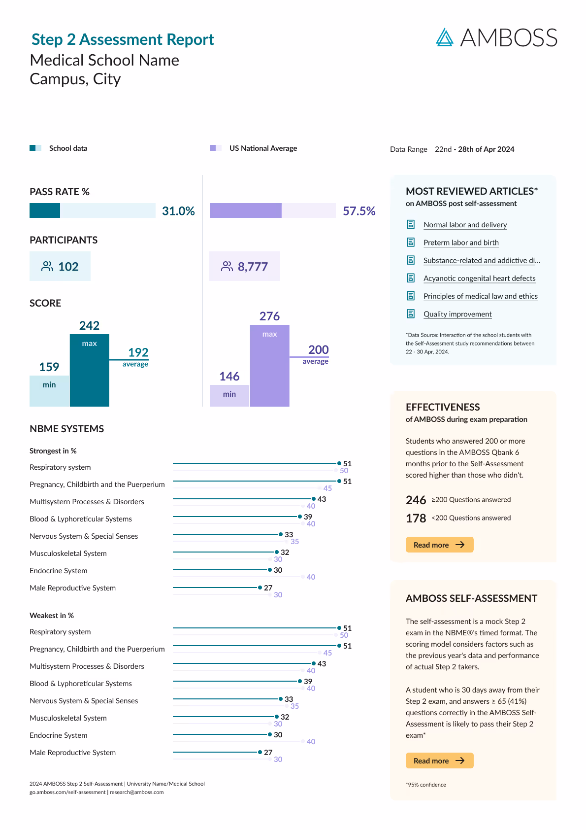 Minimum, maximum and mean score of your students, including a chart showing the range of predicted USMLE® Step 2 scores.